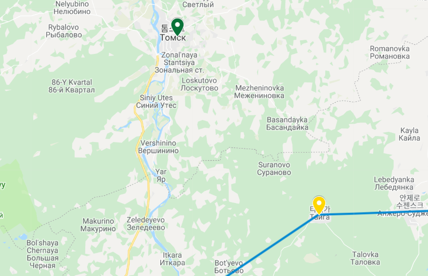 아래에 가로질러가는 선이 횡단열차 노선상에 있는 포인트가 타이가, 상단이 톰스크.